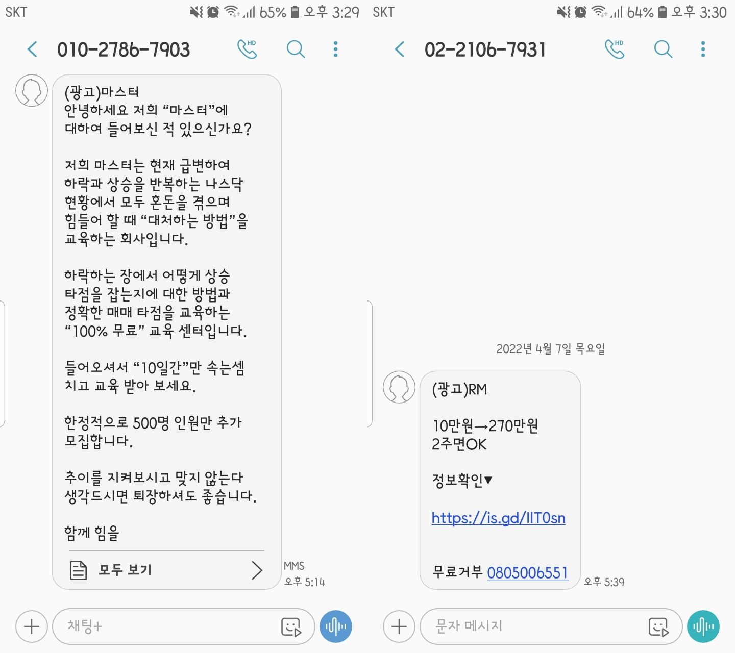 위 그림들은 내 스마트폰으로 받은 문자메시지 들이다. 대다수가 주식 관련 추천 문구인데 이들의 링크를 클릭하면 내 폰에 악성 코드가 깔려 내 개인정보를 빼가거나 은행 앱의 돈을 탈취할 가능성이 있다.