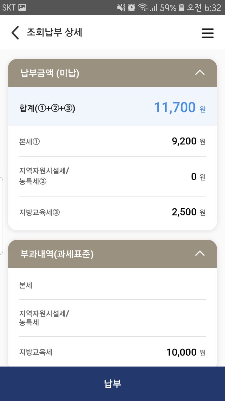 그럼 현재 고지된 주민세에 대하 내역이 나타난다. 바로 "납부" 버튼을 눌러도 되지만 납부 버튼을 누르면 전체 고지된 금액에 대해 일괄 납부를 하게 된다. 납부 내역만 클릭하면 그 내역만 납부하게 된다. 일단 고지된 내역이 어떻게 되는지 확인해 보기 위해 납부 내역을 클릭하면 오른쪽 그림과 같이 내역이 나타나게 된다.